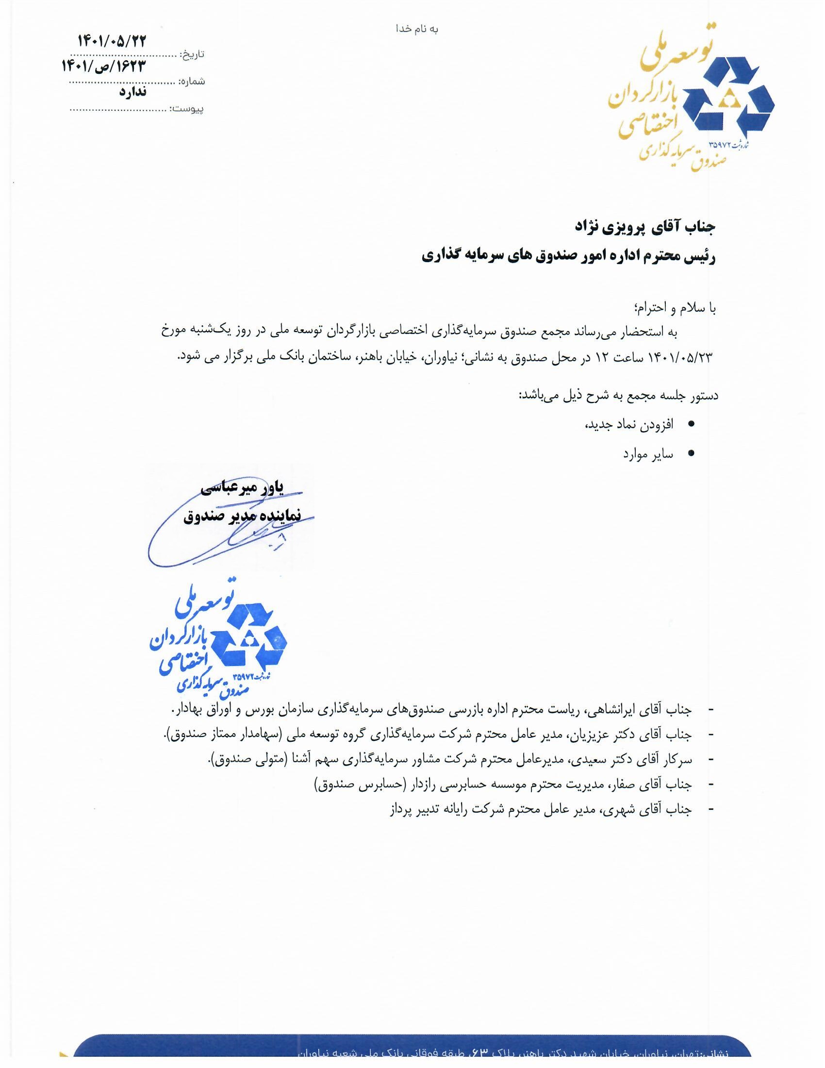 آگهی دعوت به مجمع به تاریخ 05 شهریور 1401 (تغییر کارمزد مدیر)
