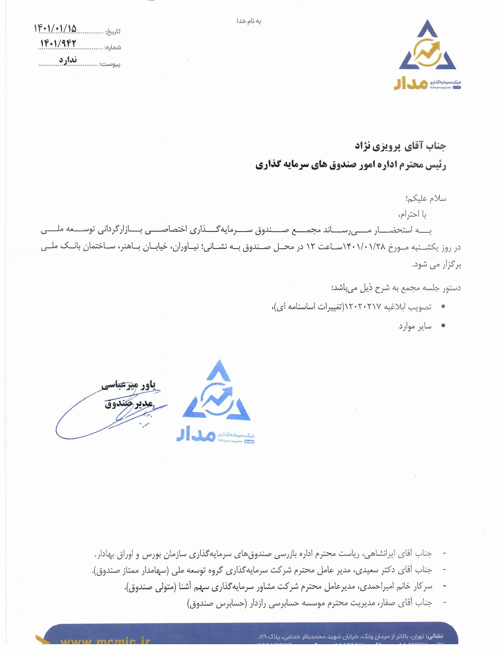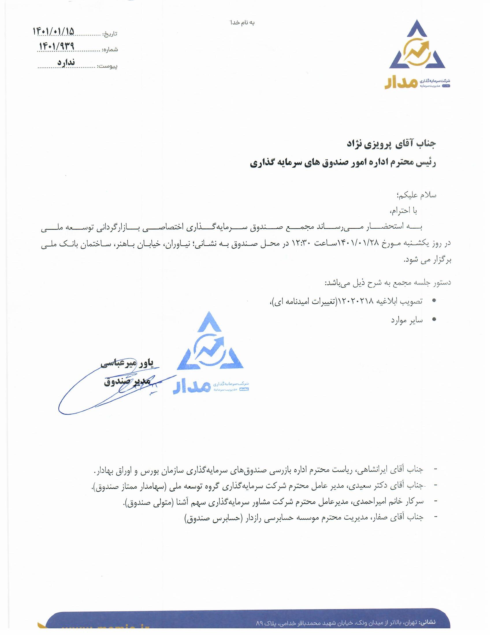 آگهی دعوت به مجمع به تاریخ 1401/01/28(تصویب ابلاغیه 12020218- تغییرات امیدنامه ای )