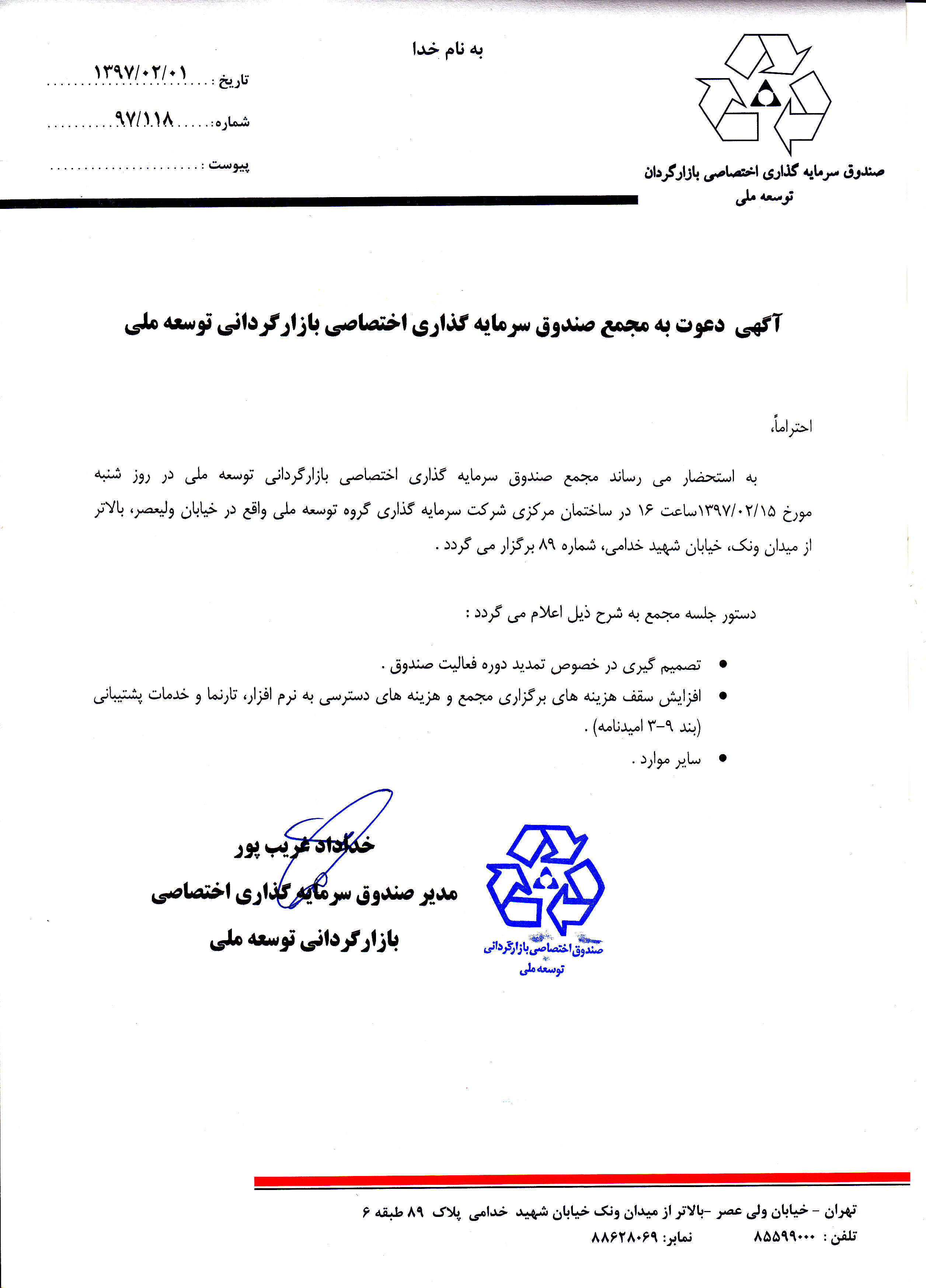 | عنوان خبر | آگهی دعوت به مجمع صندوق سرمایه گذاری اختصاصی بازارگردانی توسعه ملی به تاریخ 1397/02/15 |