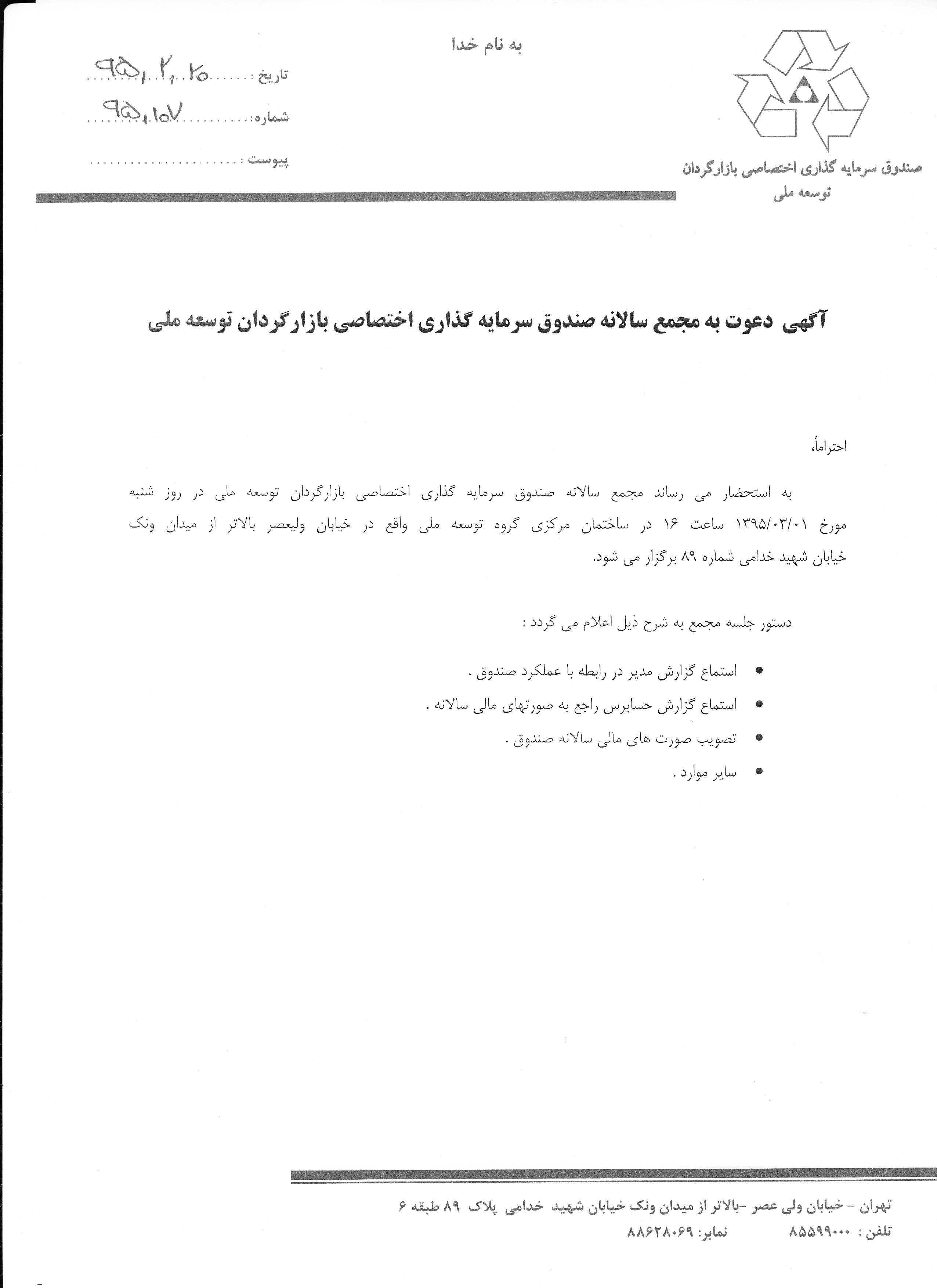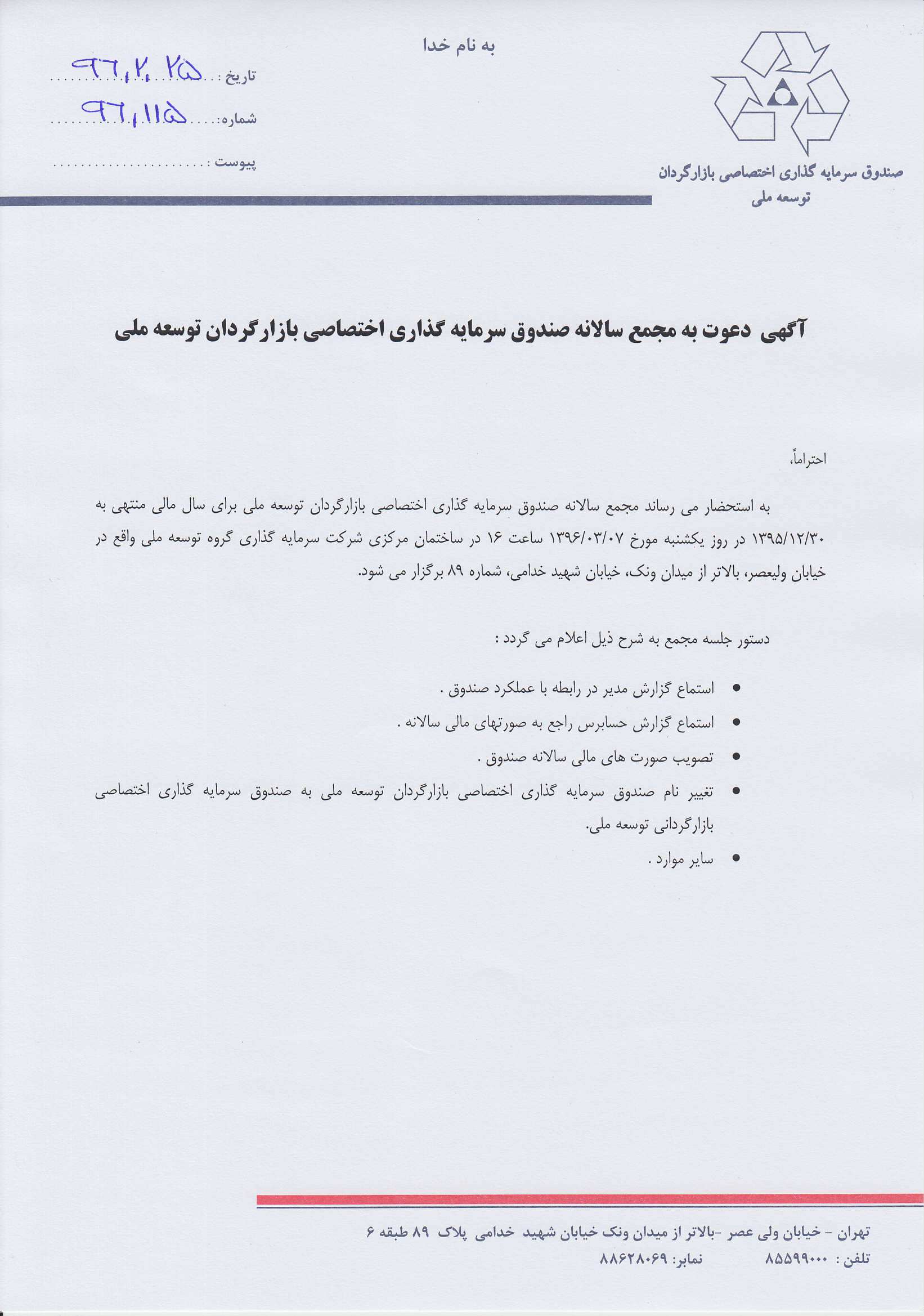 آگهی دعوت به مجمع سالانه صندوق سرمایه گذاری اختصاصی بازارگردان توسعه ملی به تاریخ ۱۳۹۵/۰۳/۰۱