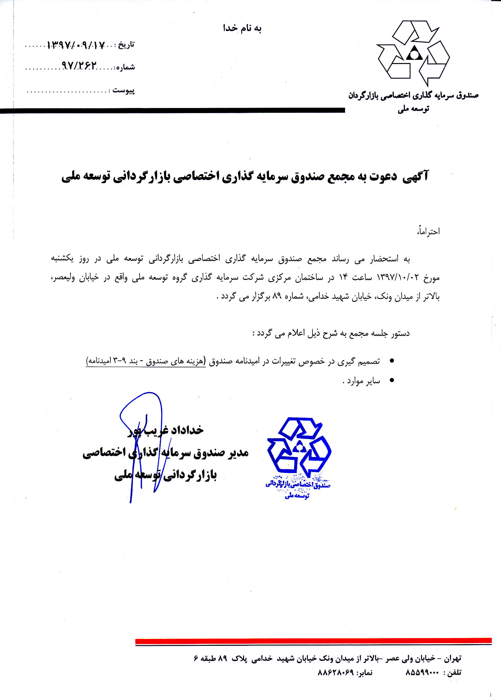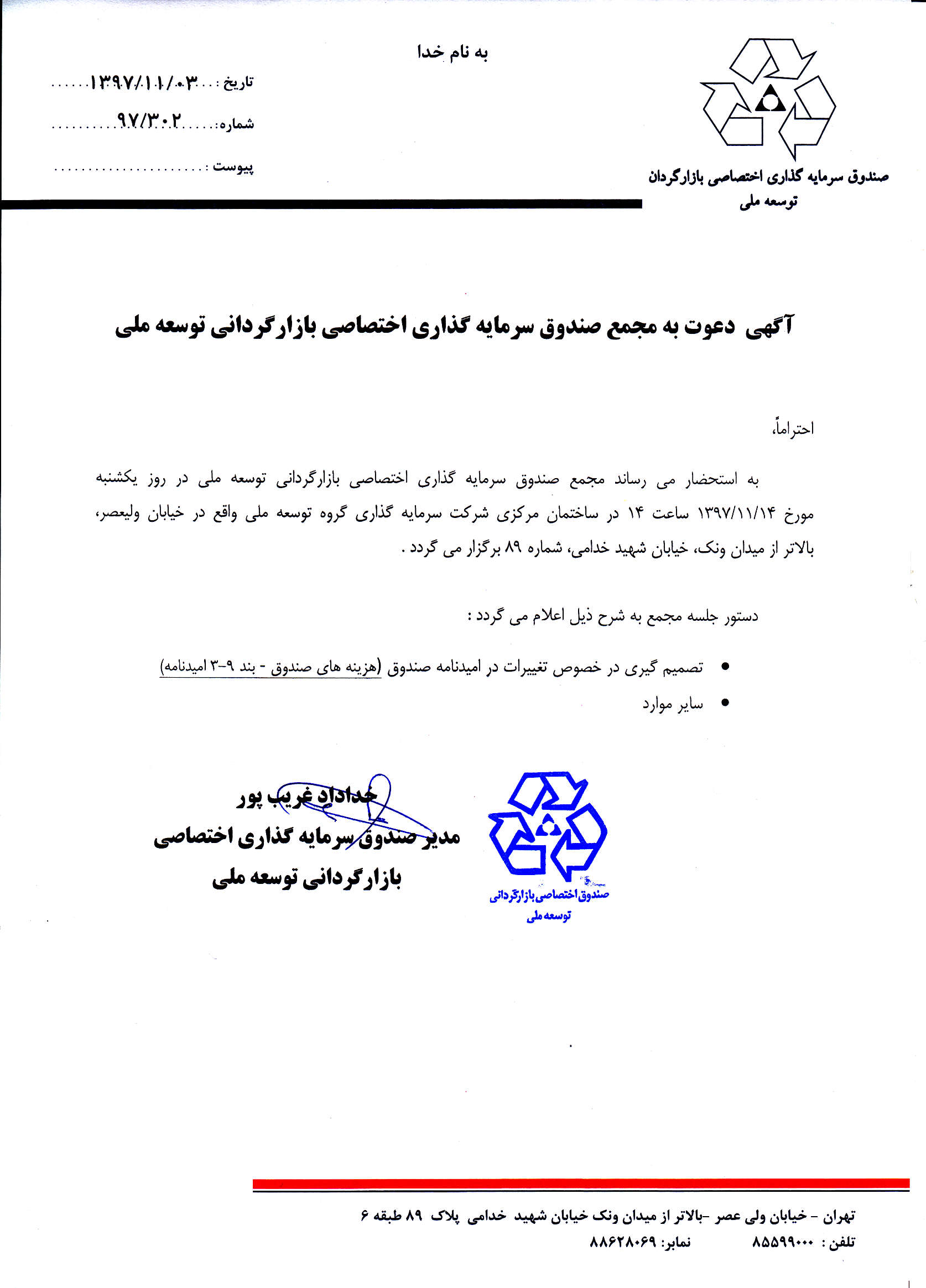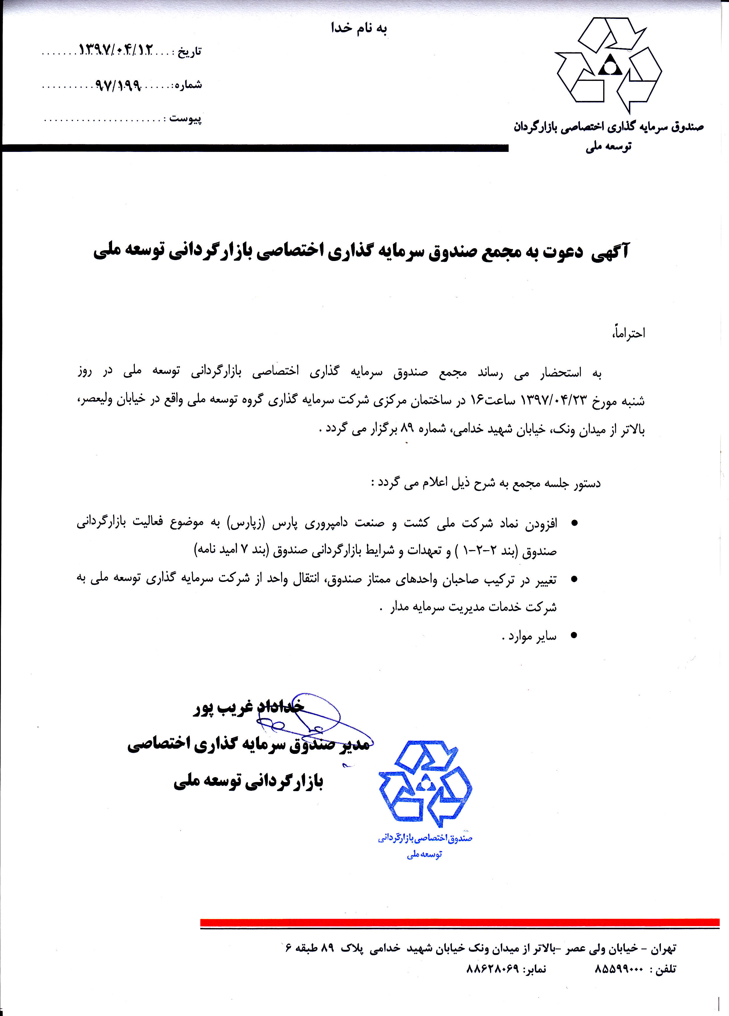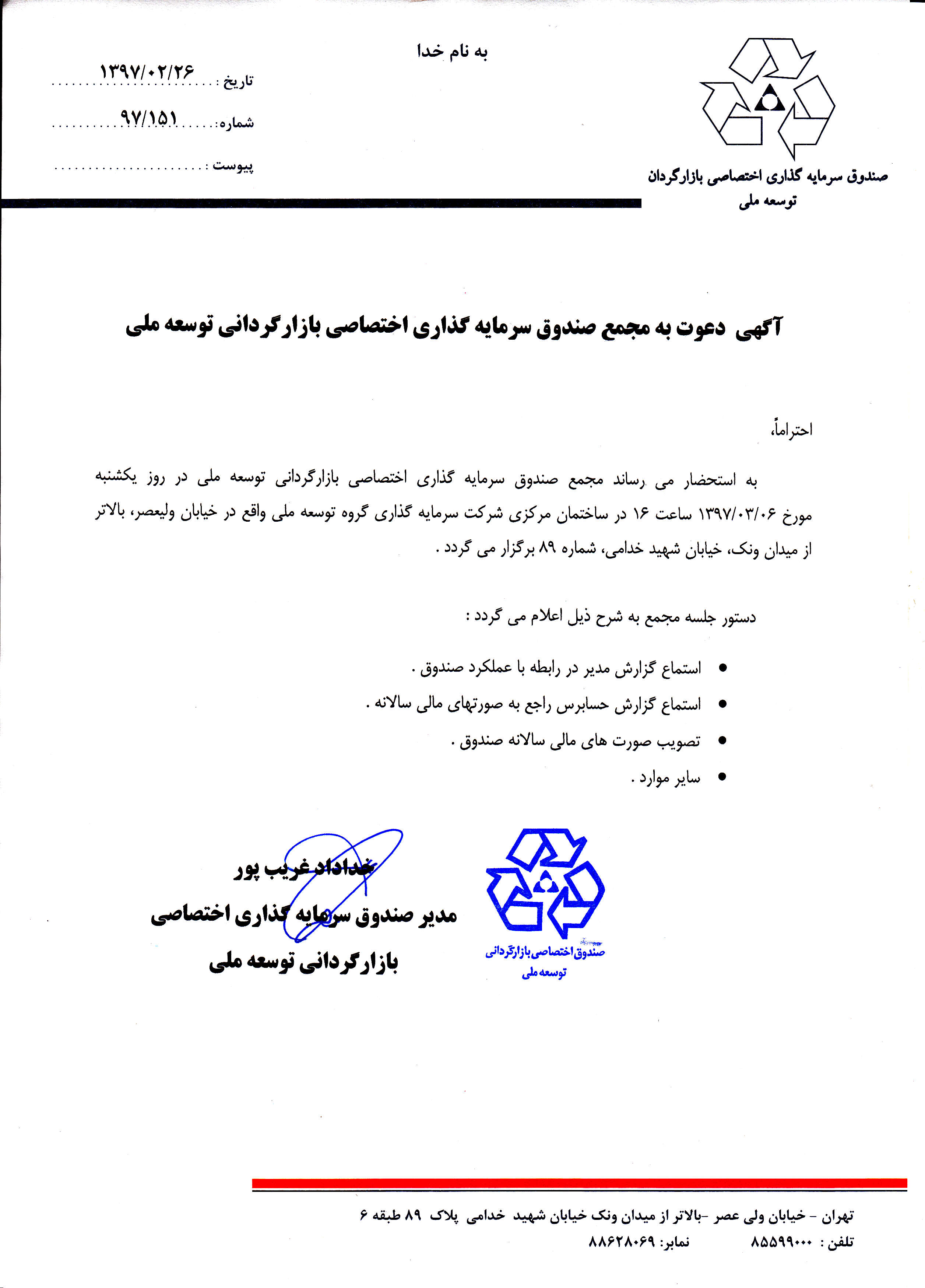 آگهی دعوت به مجمع صندوق سرمایه گذاری اختصاصی بازارگردانی توسعه ملی به تاریخ ۱۳۹۷/۰۱/۲۰