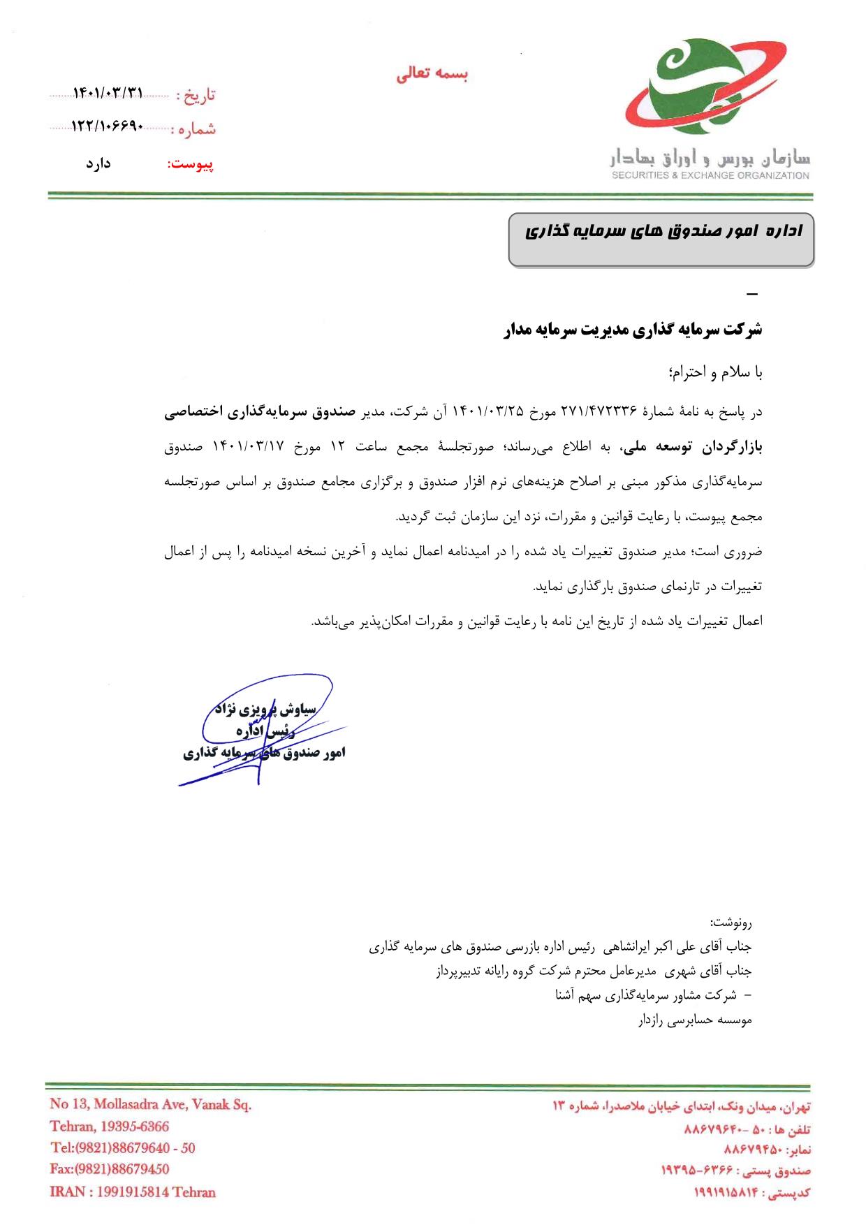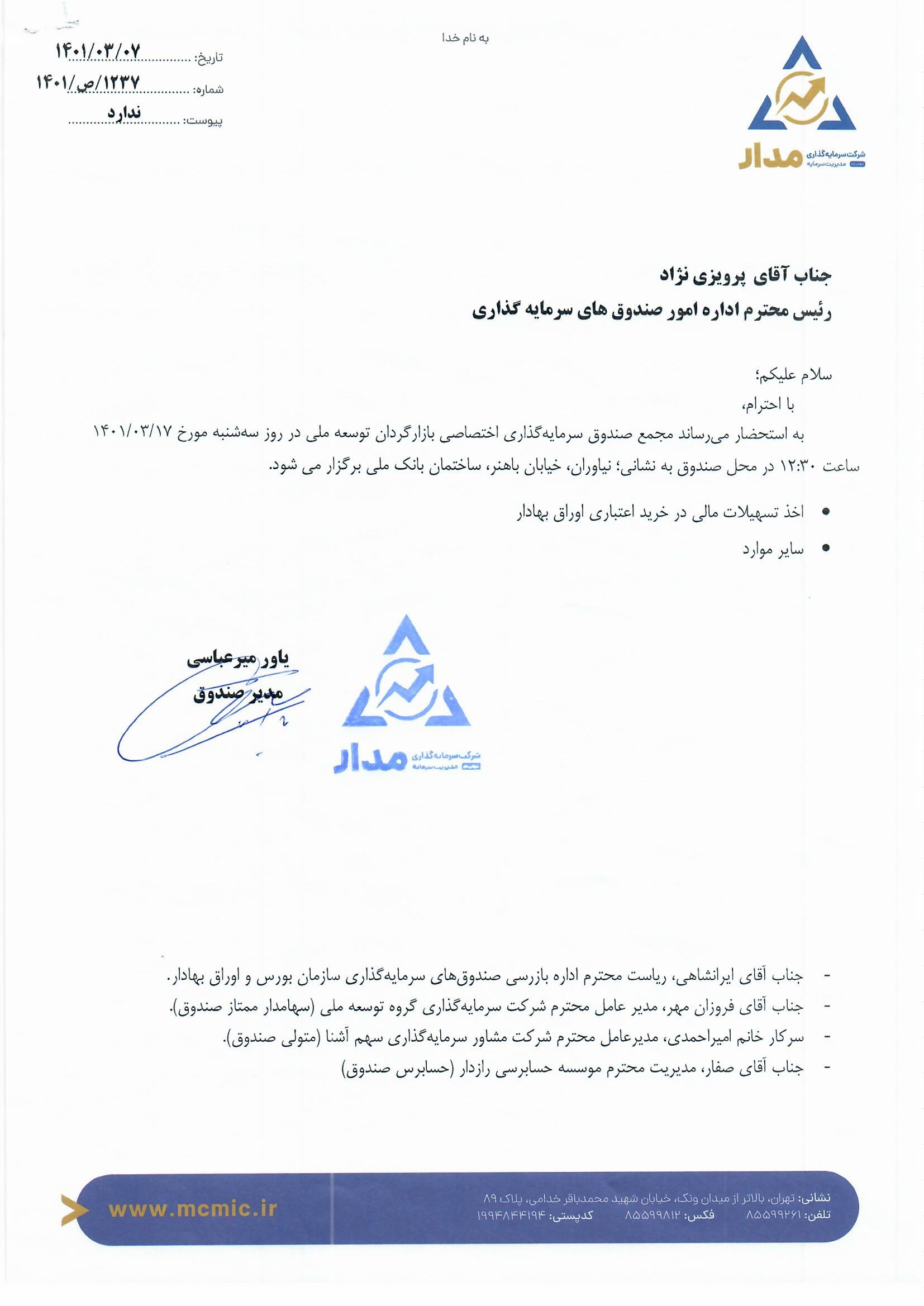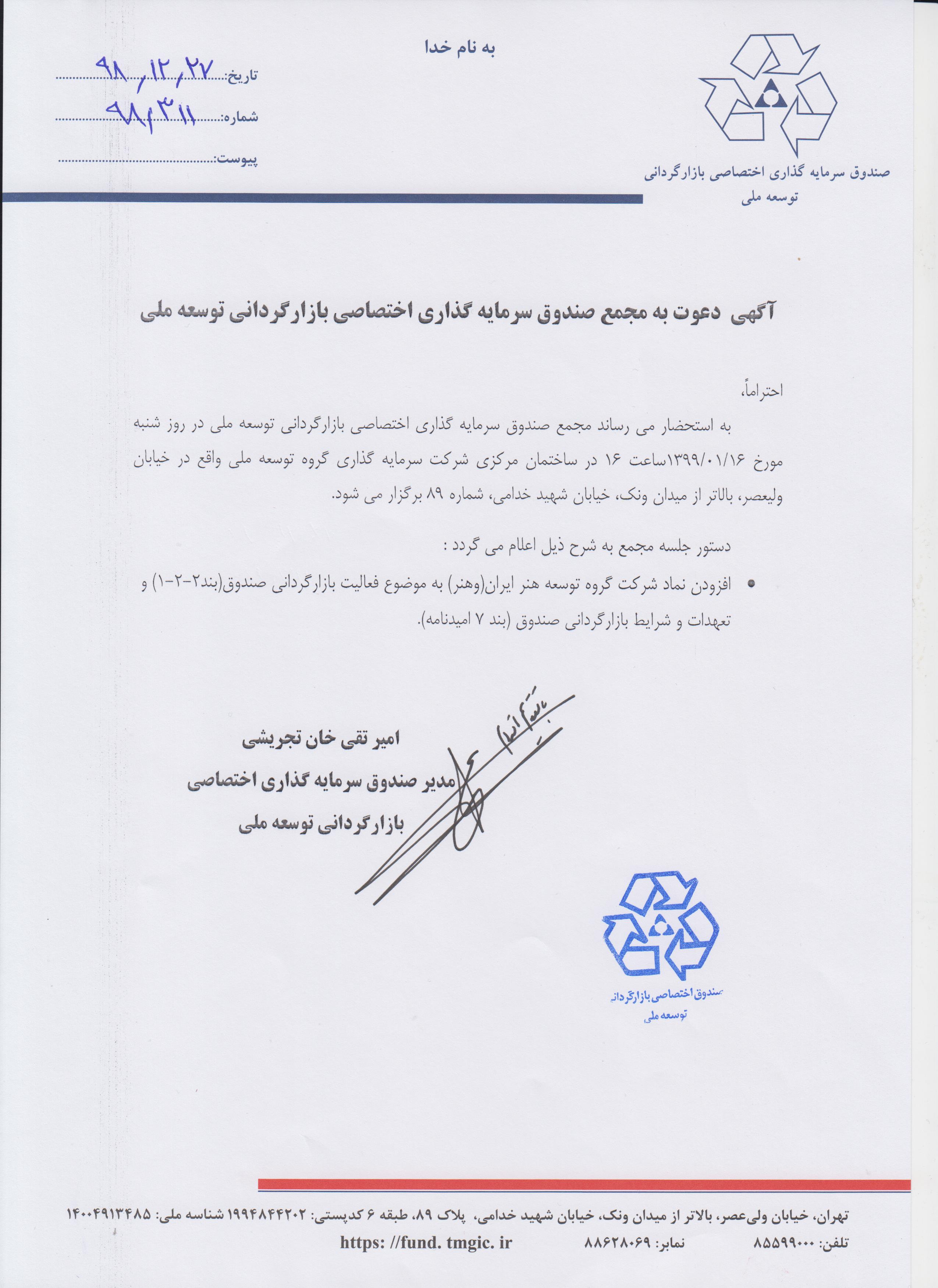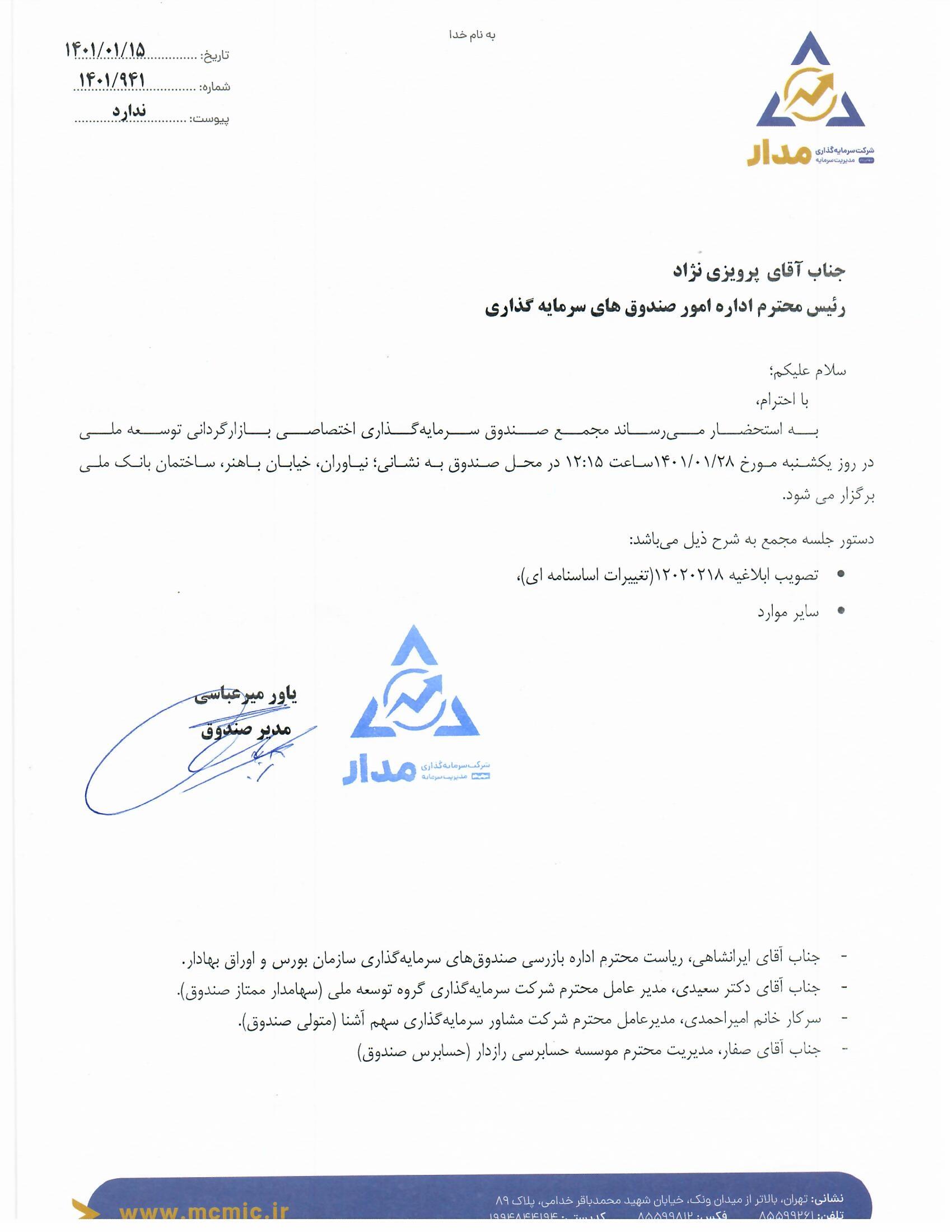 آگهی دعوت به مجمع صندوق سرمایه گذاری اختصاصی بازارگردانی توسعه ملی به تاریخ ۱۳۹۷/۰۱/۲۰