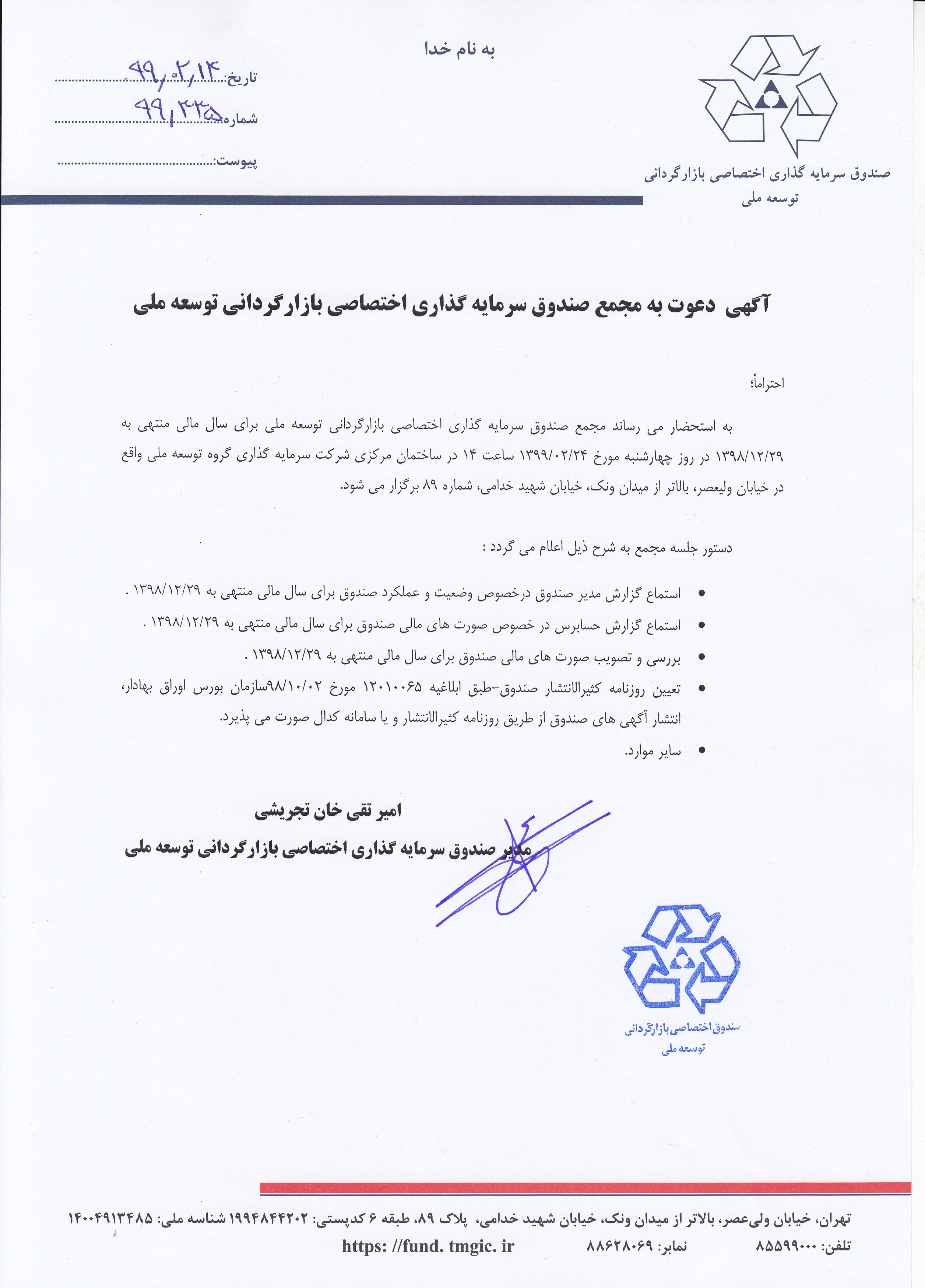 آگهی دعوت به مجمع صندوق سرمایه گذاری اختصاصی بازارگردانی توسعه ملی به تاریخ ۱۳۹۹/۰۲/۲۴(تصویب صورت های مالی سالانه)