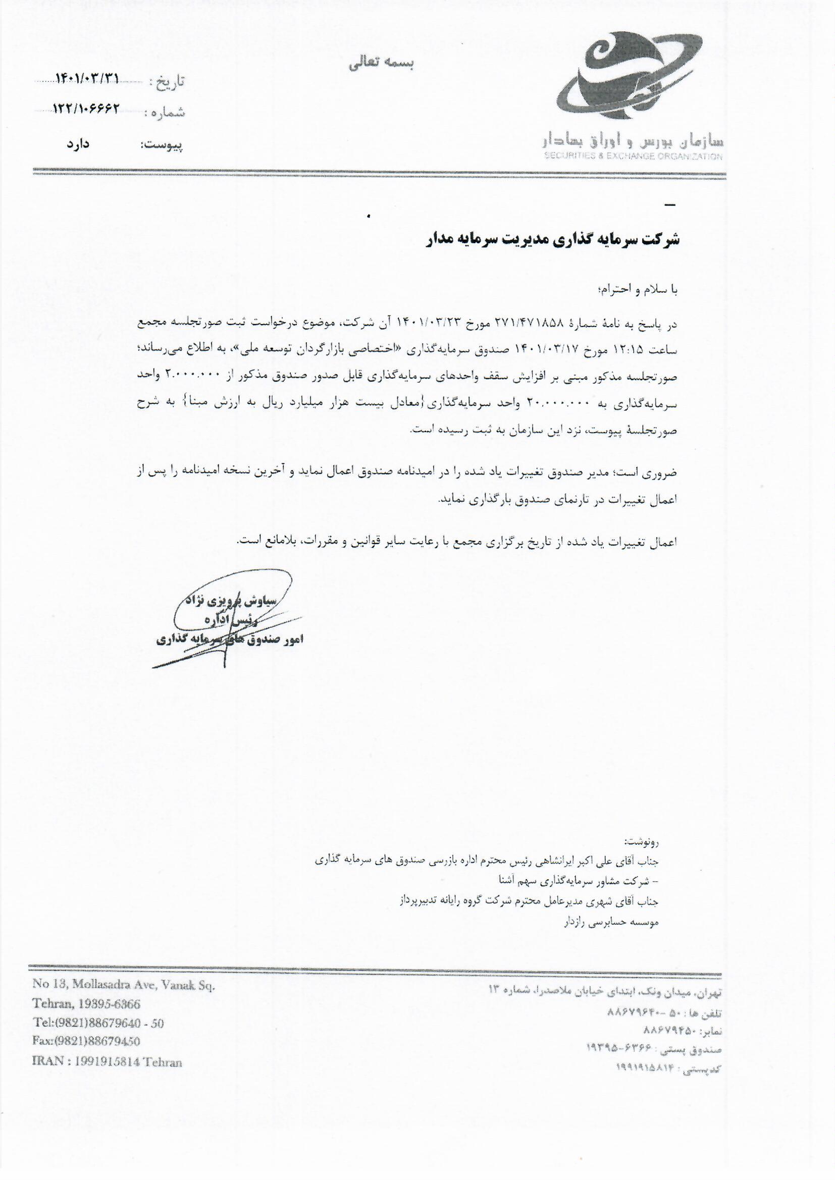 نامه تاییدیه سازمان بورس و اوراق بهادار و صورتجلسه مجمع به تاریخ ۱۳۹۷/۰۱/۲۰
