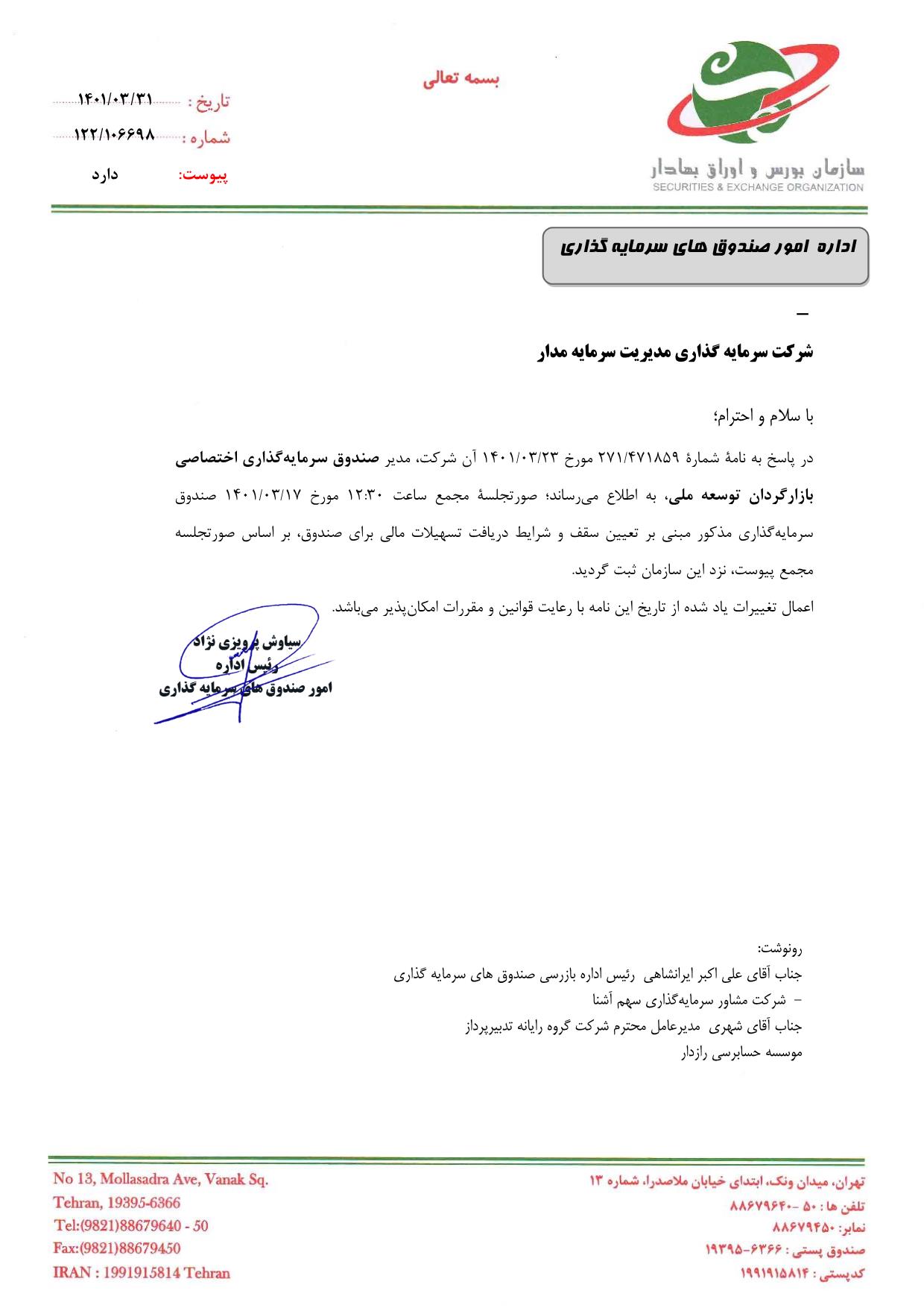 نامه تاییدیه سازمان بورس و اوراق بهادار و صورتجلسه مجمع به تاریخ۱۳۹۸/۰۳/۱۸(تغییرات امیدنامه-تغییر هزینه های ارکان)
